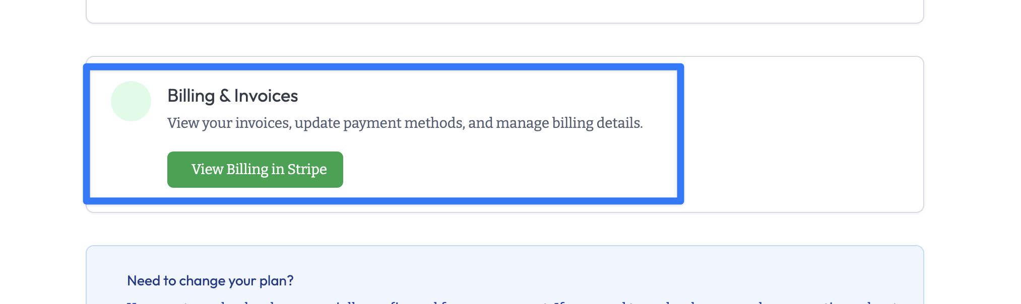 From there, you can access billing in Stripe via the “View billing in Stripe” button.