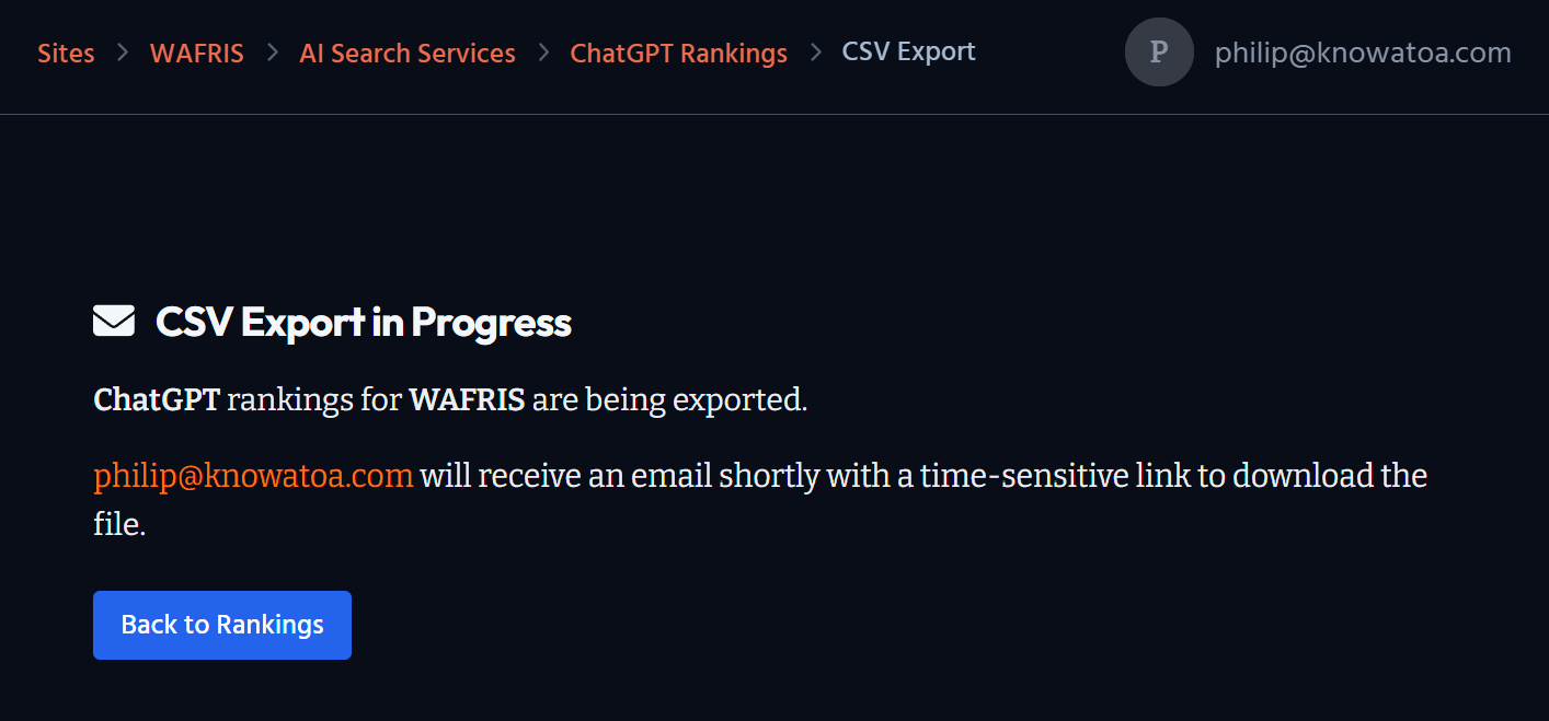 Need to share your AI search-ranking data with clients or use it in tools like Looker Studio? Here’s how to export your LLM position data from Knowatoa as a downloadable CSV file.