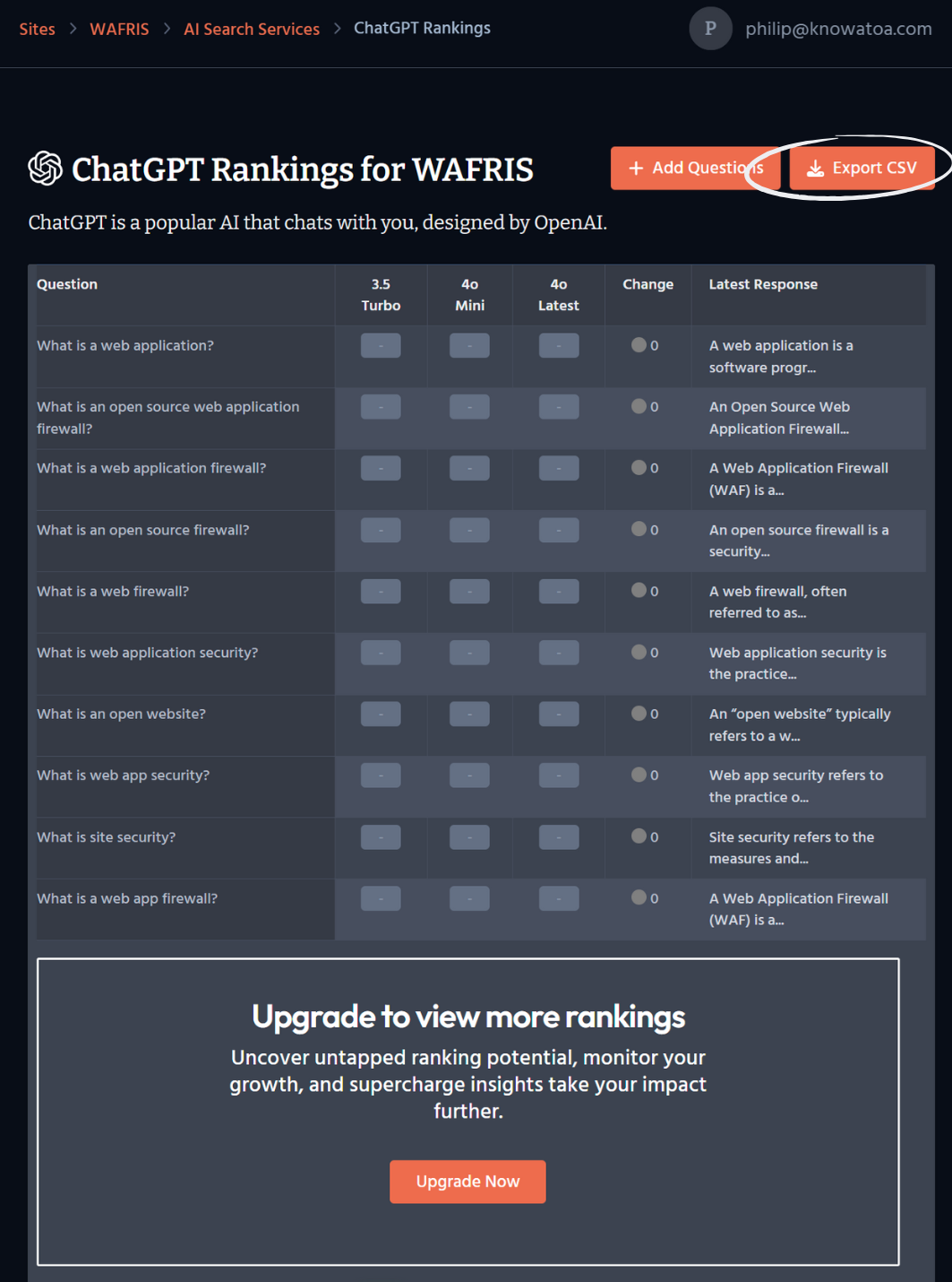 - Note: CSV export is only available for ChatGPT reports on the Free Plan. Exporting data from other LLMs (like Gemini or Claude) requires a Paid Plan.